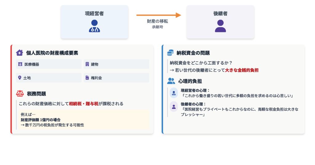 個人に相続税や贈与税がかかる場合は、基本的に個人はそんな納税資金を持っていないので、医療法人の事業用資金を借りたり、プライベート資産を売却してお金を作らないといけなくなります
