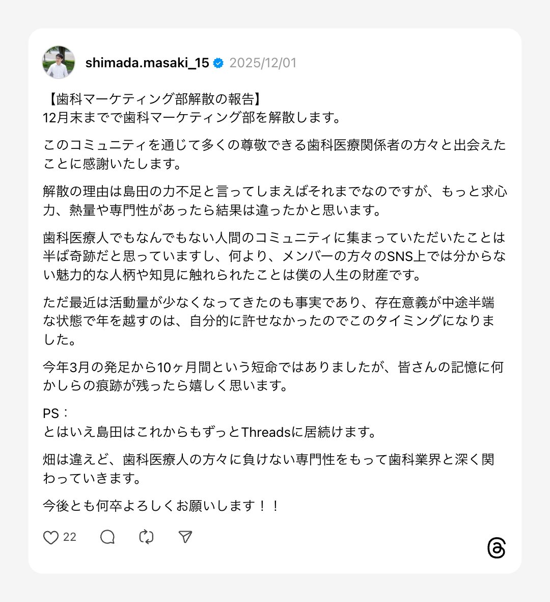結局、今の自分にはこの障害を乗り越える能力と余裕がないと気づいたので、きっぱり歯科マーケティング部を廃部することに決めました。
