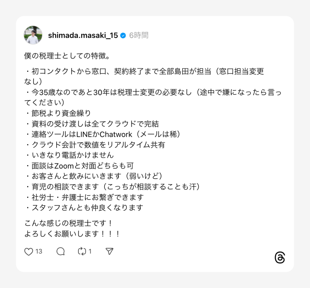 ThreadsやインスタからDMをいただく方は新規開業や承継を考えている方がほとんどです。